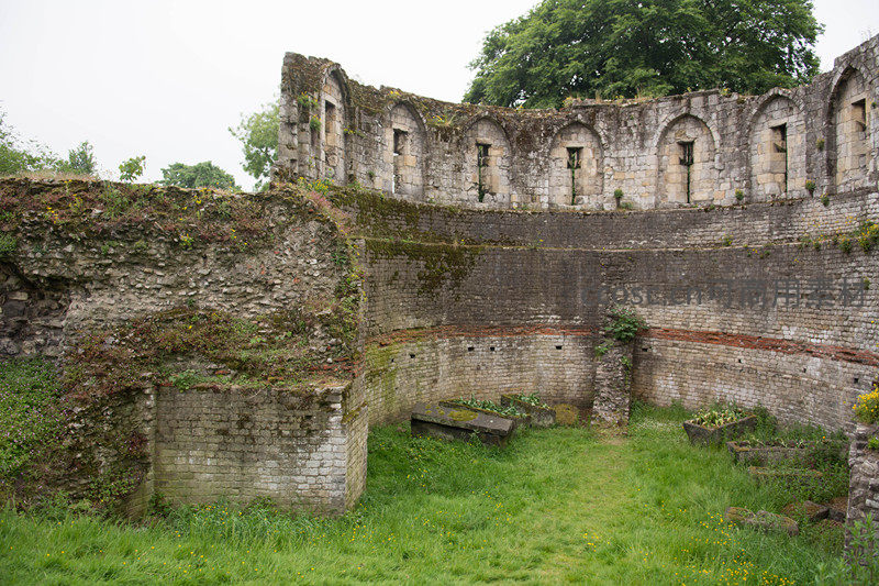一座中世纪修道院残存的环形石墙围合出宁静庭院,拱形窗洞空寂,墙体布满青苔与野草;几处石凳散落草地间,阳光透过树影洒落,诉说着时光流逝与自然对人工遗迹的温柔收复。