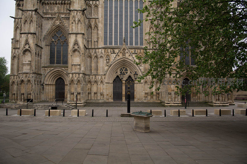 约克大教堂正面全景展现典型哥特式风格,尖拱门、飞扶壁与巨型彩窗错落有致,浅色砂岩在阴天光线下质感厚重;前景广场空旷宁静,绿树掩映增添生机,体现中世纪宗教建筑的肃穆与艺术高度。
