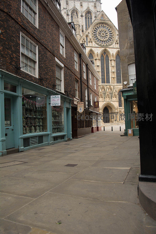 窄巷尽头约克大教堂玫瑰窗与尖塔,砖墙店铺林立古韵悠长