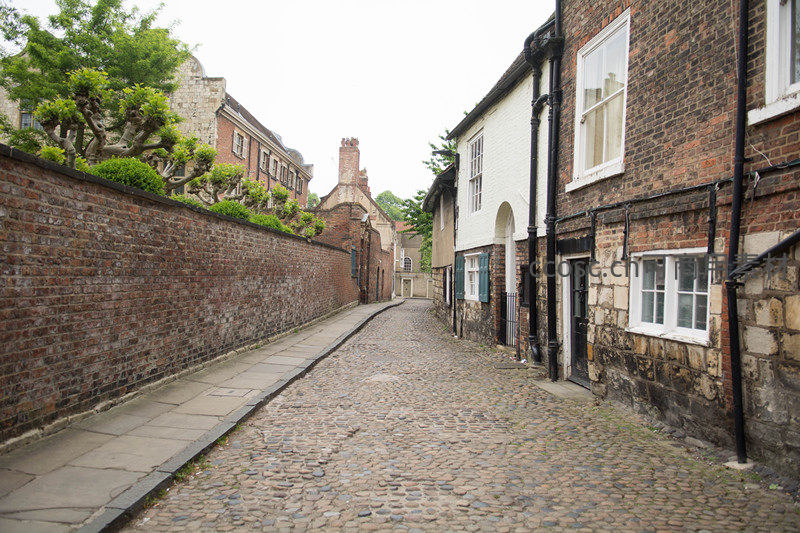 约克肉铺街旁鹅卵石小径蜿蜒,红砖墙与修剪绿植相映成趣