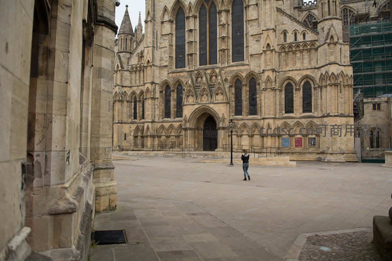 约克大教堂宏伟哥特立面,广场上孤影行人仰望