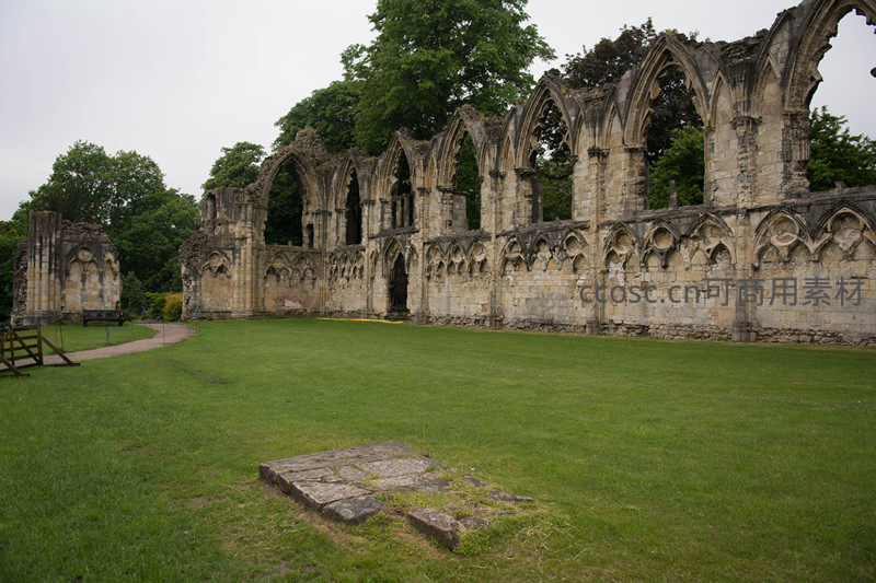约克修道院遗址:哥特式拱廊残垣矗立于翠绿草坪之上