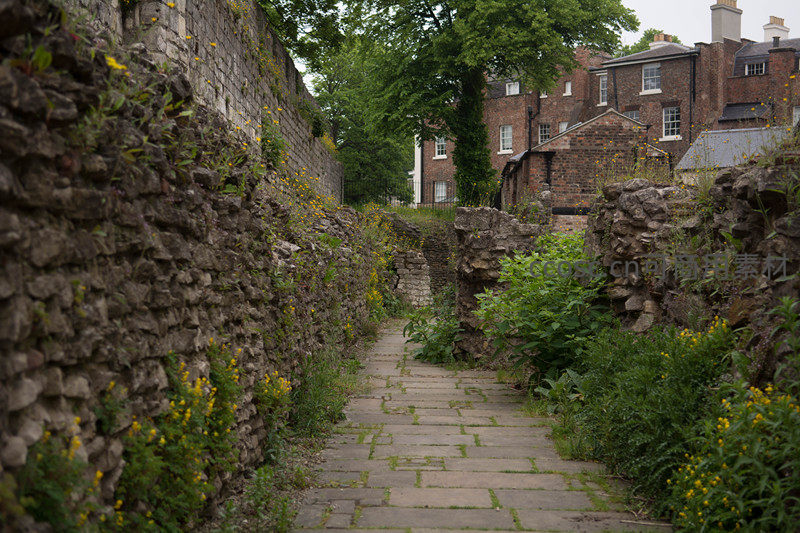 一段残存的古老石砌城墙夹峙着青石板小径,墙体缝隙中野菊与绿植蓬勃生长,背景隐约可见红砖民居;自然与人文遗存和谐共存,展现时间流逝中生命顽强与历史静默。