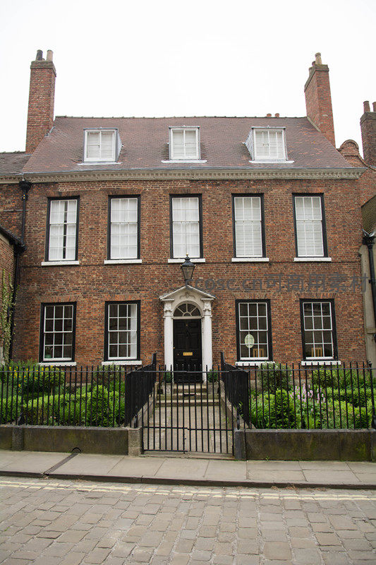 一座典型的18世纪英国乔治亚风格红砖联排住宅,对称布局,白色窗框与拱形门廊形成鲜明对比,屋顶设有三扇天窗,前院绿植环绕,黑色铁艺围栏增添古典韵味,展现浓郁的历史街区氛围。