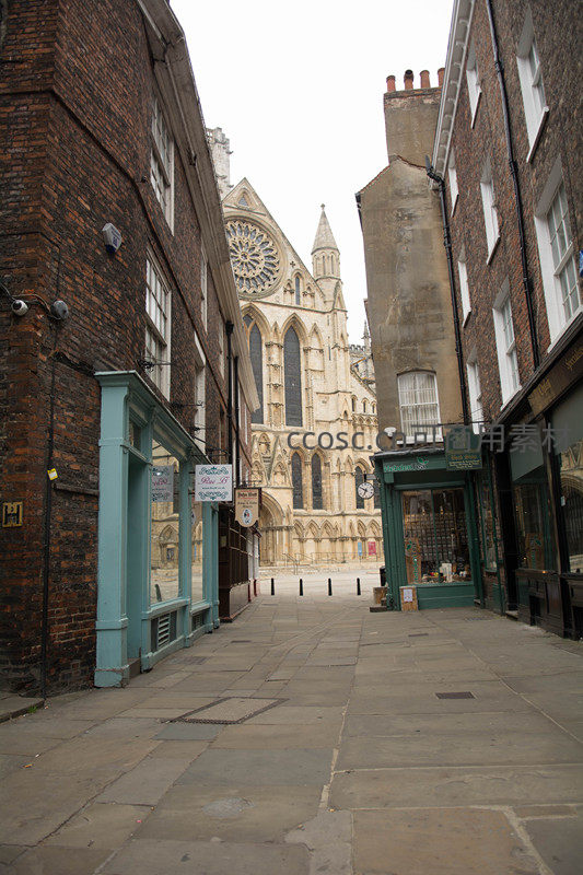 窄巷尽头约克大教堂玫瑰窗巍然矗立,古典建筑群围合出神圣纵深感