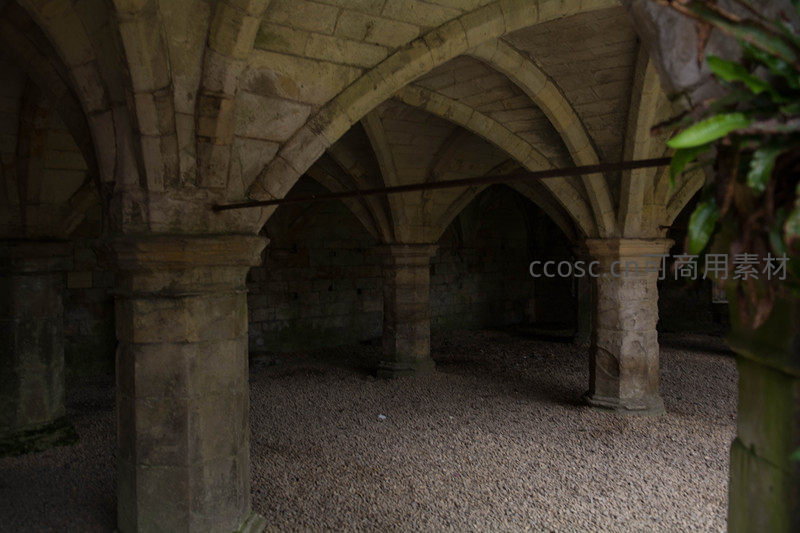 约克某处中世纪修道院地下回廊或地窖遗存,粗犷石柱与尖券拱顶构成典型哥特风格,地面铺满碎石,角落绿植蔓延,光线从高窗斜入,呈现时间凝固的庄严与苍凉美感。