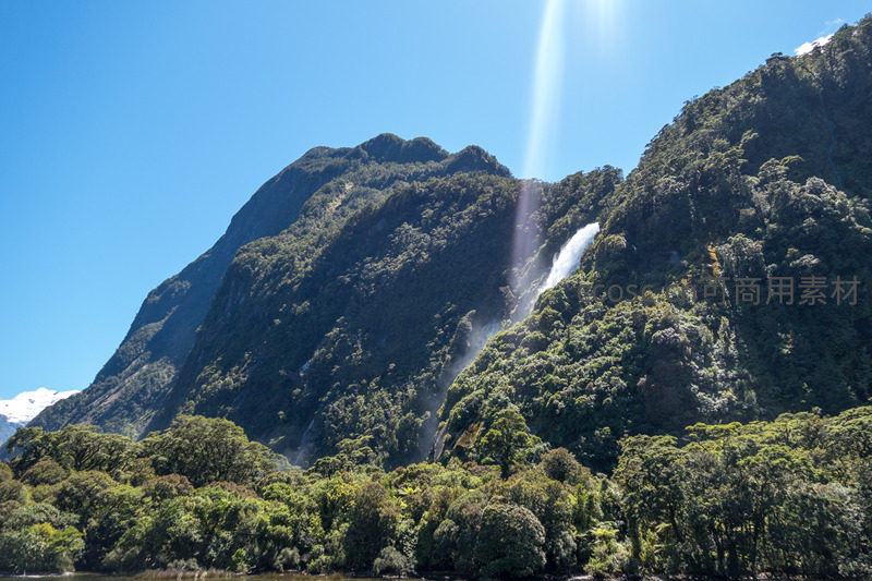 湖畔仰望巨峰瀑布群,阳光光束穿林而下如神迹降临