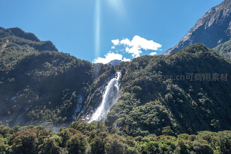 雄伟峡湾瀑布从险峻山脊奔涌而下,云影掠过苍翠峰峦