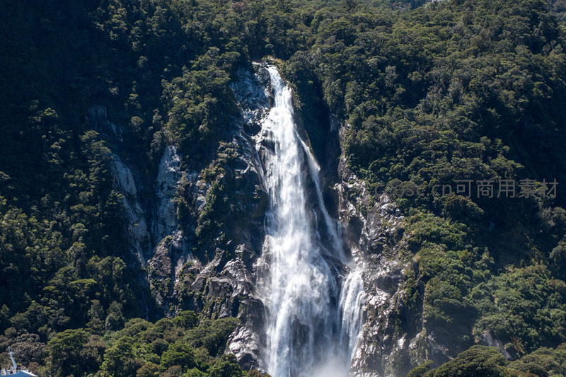 航拍密林中飞流直下的壮观瀑布,水雾弥漫,岩壁陡峭