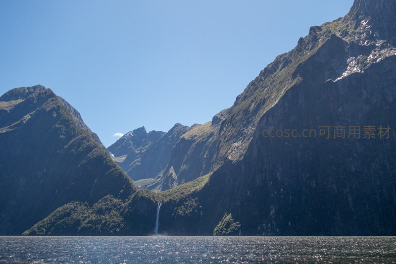 米尔福德峡湾壮丽山海景观,瀑布飞泻入碧蓝水域
