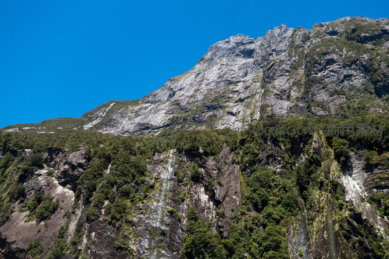 高角度俯瞰新西兰南岛峡湾国家公园山脊线,锯齿状峰顶在湛蓝天空下轮廓分明,山坡被茂密温带雨林覆盖,局部裸露岩体呈现风化痕迹,展现板块挤压形成的壮丽地貌与生物多样性并存的生态系统。