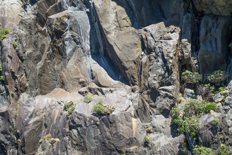 岩壁由深灰、浅褐、乳白等多色岩层构成,细密的黄褐色石英或方解石脉呈网状贯穿;局部风化剥落显露出新鲜断面;少量低矮植物依附生存,整体构图富有节奏与韵律感。