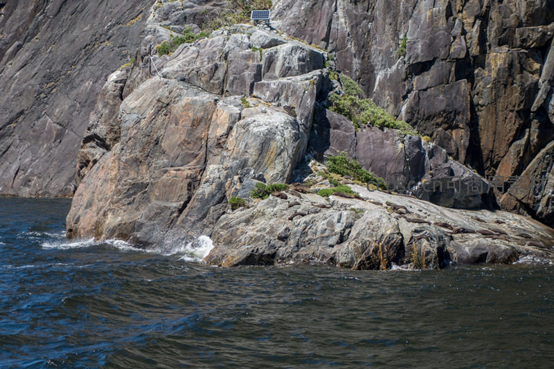 海岸岩礁边缘浪花拍打,岩面斑驳处可见小型太阳能板装置