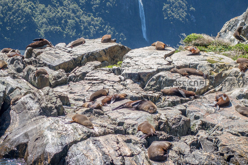 正午阳光下,海狮们或蜷卧或伸展,安静享受岩面暖意;后方垂直崖壁上清泉飞流直下,汇入幽深峡湾,四周植被茂密,呈现未受干扰的纯净自然状态。