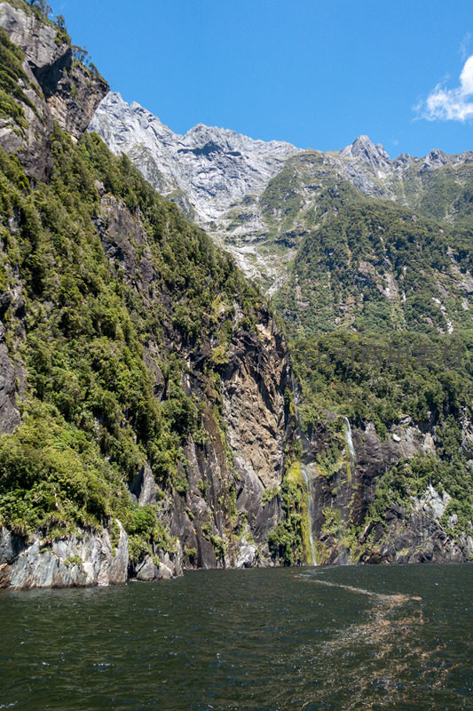 峡湾峭壁瀑布飞泻,绿植覆盖岩壁,碧水映蓝天