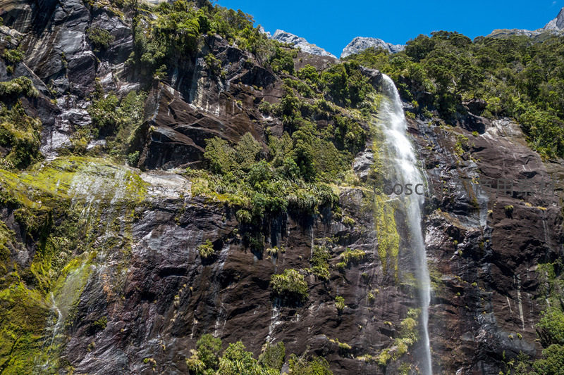 高耸岩壁间银练垂落,苔藓点缀黑岩,生机盎然