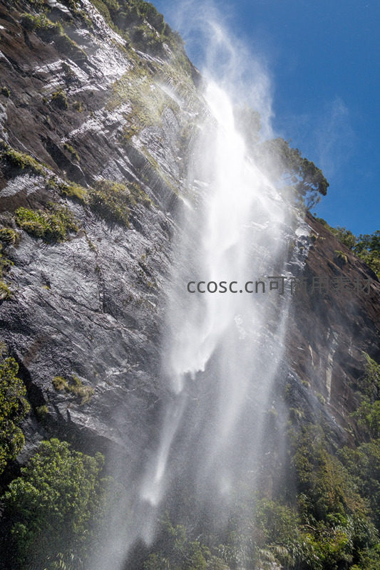 以低角度仰拍捕捉瀑布自高崖奔涌而下的震撼瞬间,水流撞击岩面激起层层白雾,青翠林木点缀灰黑岩壁,构成强烈视觉对比与自然韵律。