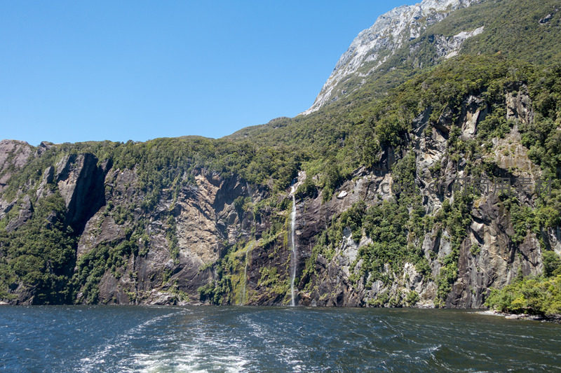 清澈细长瀑布自陡峭岩壁中央垂直跌落,注入波光粼粼的深蓝水域;背景是连绵起伏、植被丰茂的山脉,山顶可见残雪,天空湛蓝无云,构成一幅层次分明、宁静壮阔的峡湾经典画面。