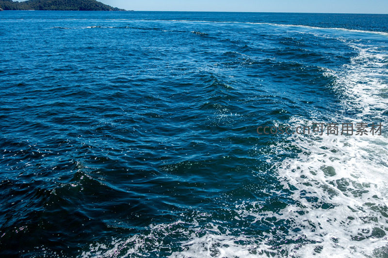 从船尾视角拍摄,洁白浪花与泡沫随航迹向右后方延展,深邃蓝绿色海水泛起层层波纹,远处隐约可见陆岸轮廓;阳光折射于水珠之上,展现海洋运动的瞬时美感与力量。