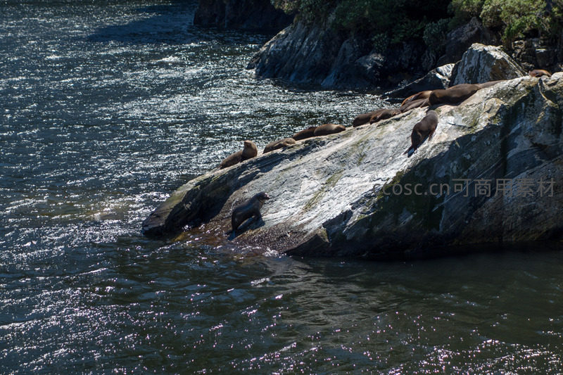 单只海狮攀爬湿滑岩壁,同伴静卧高处观望