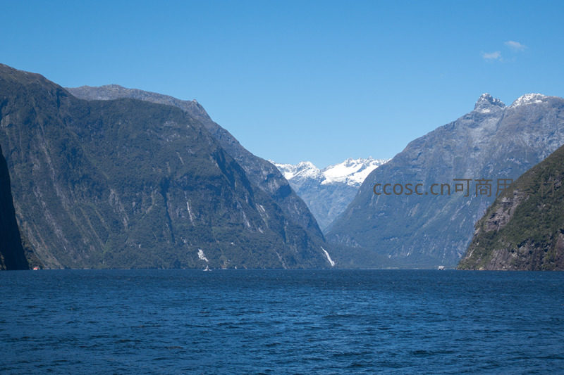 开阔视角下,峡湾延伸至远方,两侧高耸山体层叠起伏,山顶积雪在阳光下闪耀;近处深蓝色水面波光粼粼,几艘小船点缀其间,呈现纯净无污染的南半球高山峡湾生态系统之美。