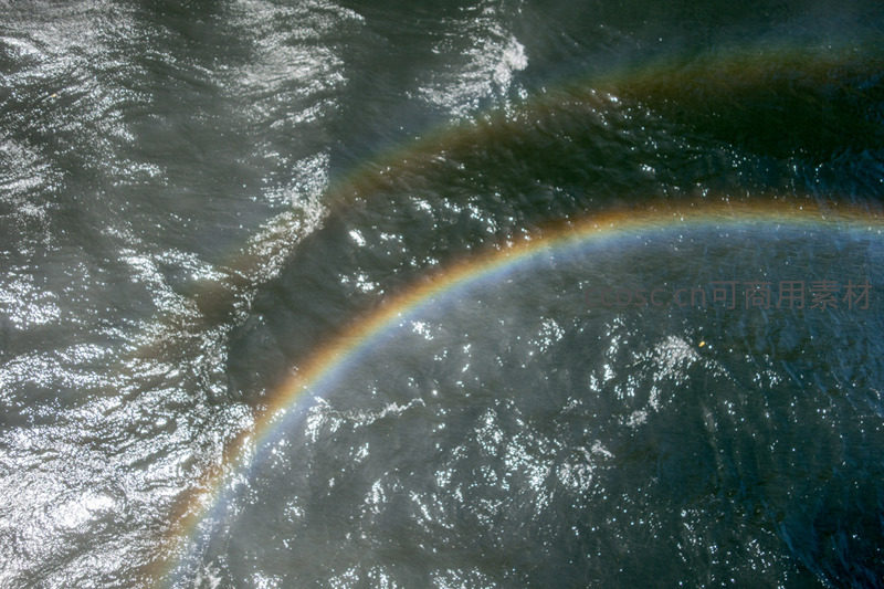特写镜头聚焦湍急水流表面,主彩虹清晰明亮,副虹隐约可见且色序反转;阳光在无数微小水滴中反复折射反射,形成层次丰富的光谱带,水面波纹增强视觉流动感与真实质感。