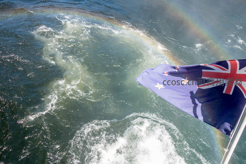 新西兰国旗在船尾飘扬,海面彩虹与浪花交织的壮丽航拍瞬间
