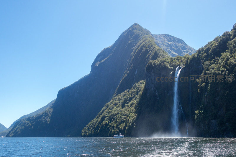 阳光明媚下,新西兰米尔福德峡湾高耸陡峭的岩壁覆盖茂密绿植,一道飞瀑自悬崖倾泻入海,水面波光粼粼,远处游船点缀其间,展现原始而雄奇的自然之美。
