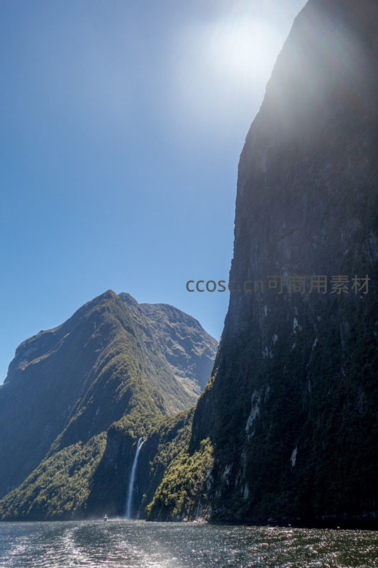 强逆光下,太阳耀斑洒落峡湾右侧峭壁,左侧山体轮廓清晰,双层瀑布如银链垂挂于青翠山腰,小船在深色水域中穿行,形成明暗对比强烈的戏剧性自然画面。