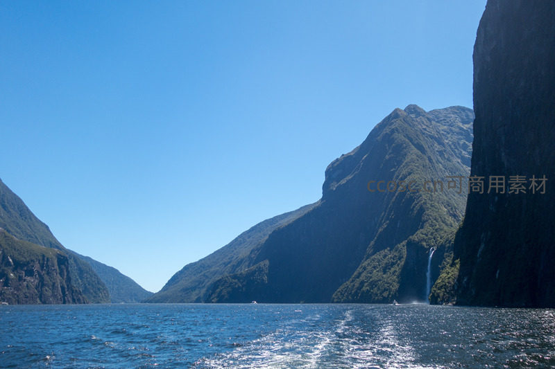 米尔福德峡湾壮丽山海景观,瀑布飞泻入碧蓝水域