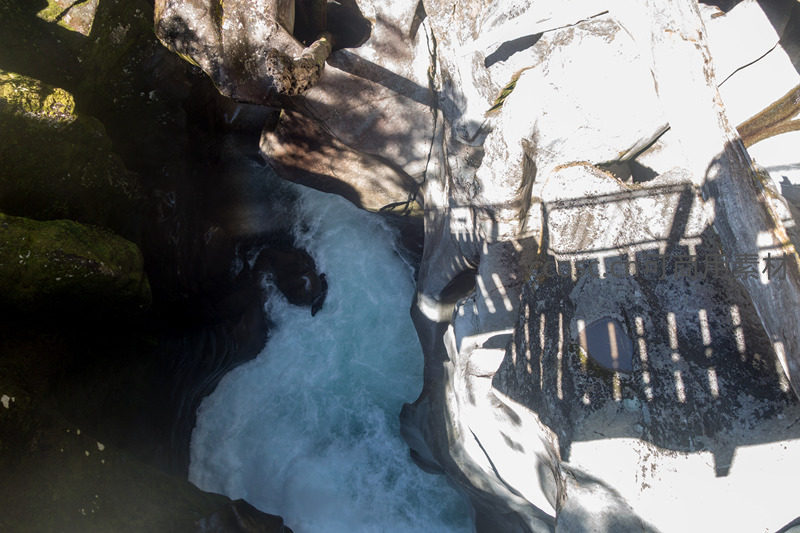 从高处俯视,湍急碧蓝水流在狭窄岩缝中奔涌翻腾,两侧灰白岩壁布满青苔与风化纹理;阳光斜射形成明暗对比强烈的条纹光影,凸显地貌险峻与水流力量,极具视觉冲击力。