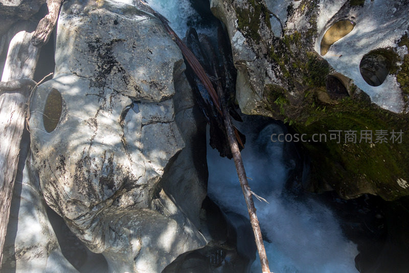 清澈湍急的溪流在嶙峋灰岩间奔涌穿行,岩壁布满翠绿青苔与斑驳光影;枯枝横亘其间,构成天然画框,展现原始森林中水与石的动态交响与静谧共生。