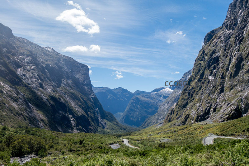 U型峡谷中蜿蜒公路穿行绿谷通向远山雪顶