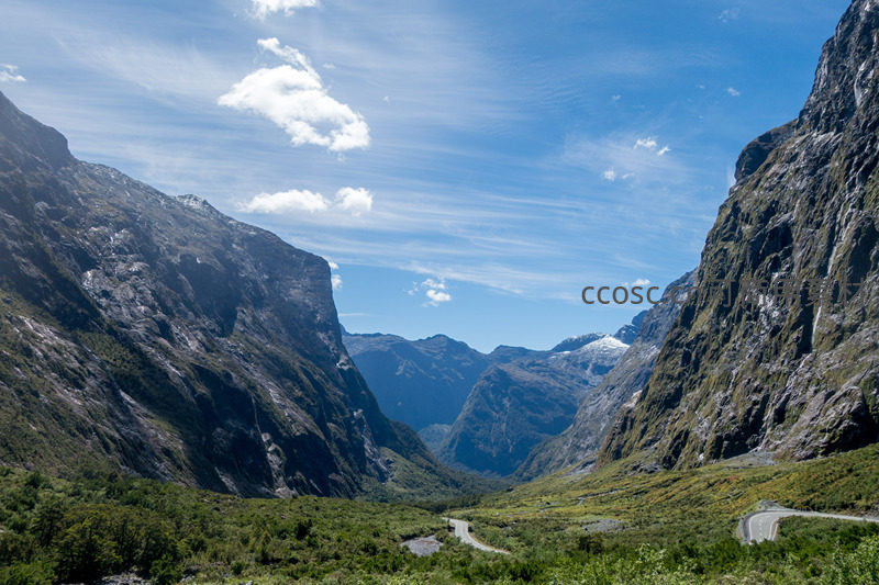 开阔山谷中双车道公路如丝带般盘绕于翠绿坡地,两侧高耸岩壁纹理清晰,远山覆雪隐现天际,阳光倾泻营造明暗对比强烈的立体景观。