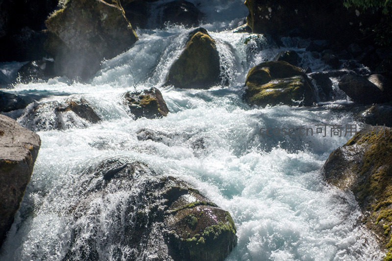 湍流绕石奔腾不息,阳光映照水珠晶莹,苔痕斑驳见证岁月流转