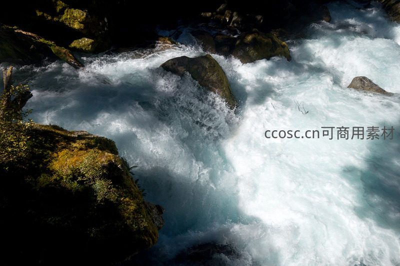 逆光下激流冲刷青苔巨石,明暗对比强烈动感十足