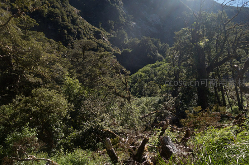 山谷密林深处光影交错,残桩断木诉说生态演替故事