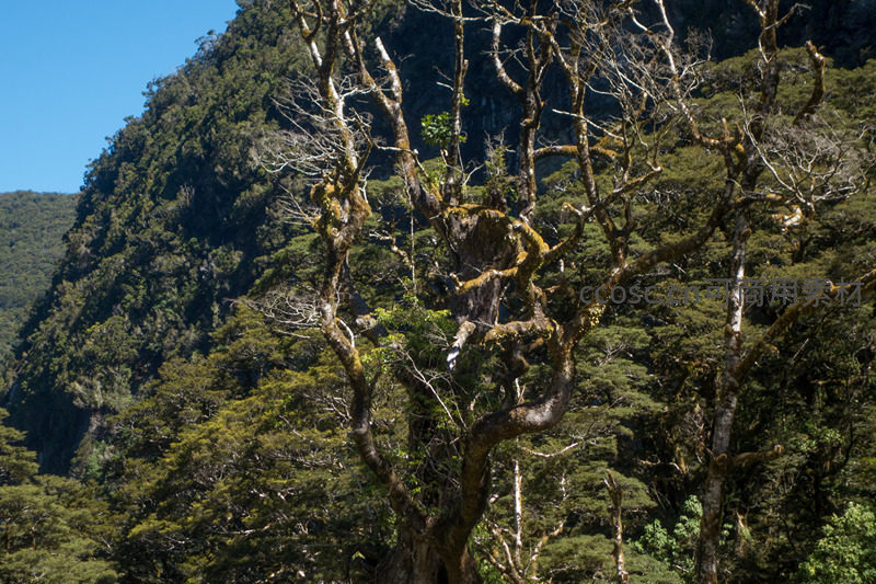 中景构图聚焦一棵主干粗壮、枝桠光秃却缀满黄绿苔藓的老树,背后是连绵起伏的深绿山林与陡峭岩坡,晴空湛蓝,凸显原始山林的静谧与时间沉淀感。
