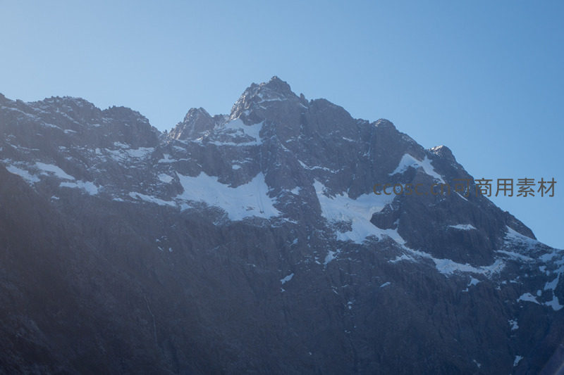 晴空万里下,陡峭花岗岩山体拔地而起,峰顶与岩槽残留皑皑积雪;阳光勾勒出嶙峋棱线与阴影层次,展现高海拔地区风化侵蚀形成的粗犷地貌与纯净苍穹的强烈对比。