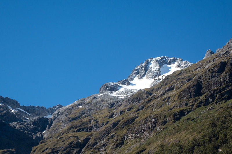 雪顶山峦傲立晴空,草甸斜坡延伸至岩壁,明暗交界处生机盎然
