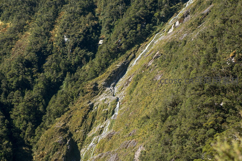 清澈溪水沿陡峭岩壁蜿蜒跌落,形成数道细长白练般的瀑布群,水流冲击处泛起水雾;两侧密布常绿阔叶林与针叶林,光影透过树冠洒落,营造出幽静灵动的高山峡谷生态画面。