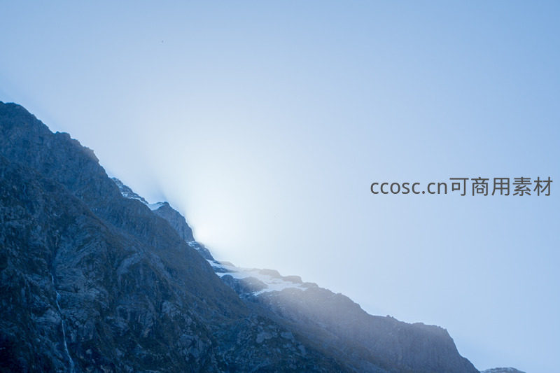 晨曦穿透云雾洒向雪峰山脊,冷色调岩壁勾勒壮丽轮廓