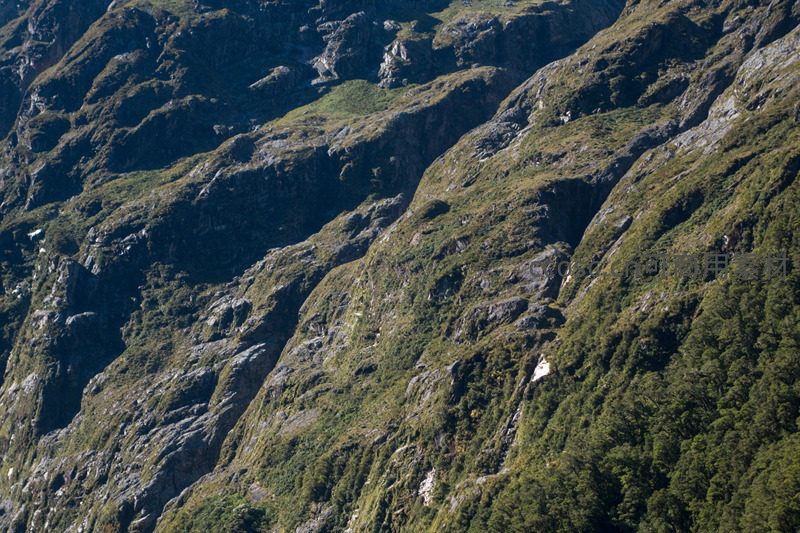 航拍陡峭山崖植被覆盖细节,光影交错展现地质纹理与生态层次