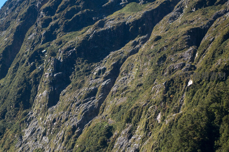 裸露岩壁与苔藓共生的山体特写,航拍呈现地质演化的沧桑质感