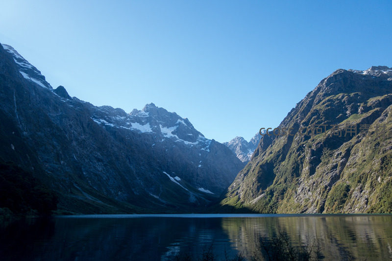 开阔山谷中碧蓝湖泊平静无波,完美倒映两侧雪峰与陡峭岩壁;晴空万里,光线柔和,近岸植被低矮,远山积雪斑驳,构成典型冰川侵蚀U型谷地貌,意境深远宁静。