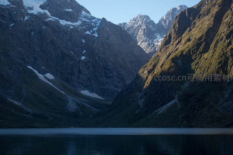 清晨阳光斜照在巍峨雪山上,冰川融水汇入幽蓝湖面;陡峭岩壁覆盖苔藓与针叶林,光影交错间展现原始山地生态系统的壮美与静谧,体现高海拔自然景观的层次与生命力。