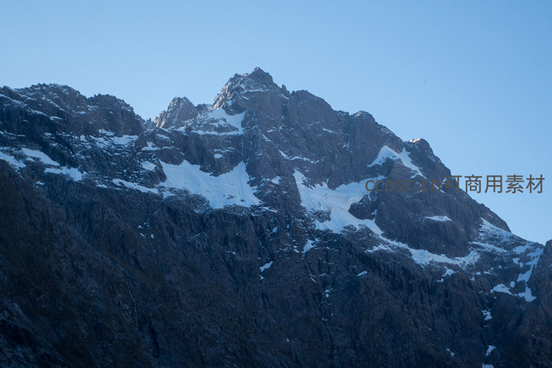 清晨光线斜照于锯齿状山峰,积雪斑驳覆盖在深灰岩壁之上,光影对比强烈;山体纹理清晰可见,展现冰川侵蚀与风化作用塑造的地貌特征,宁静而庄严。