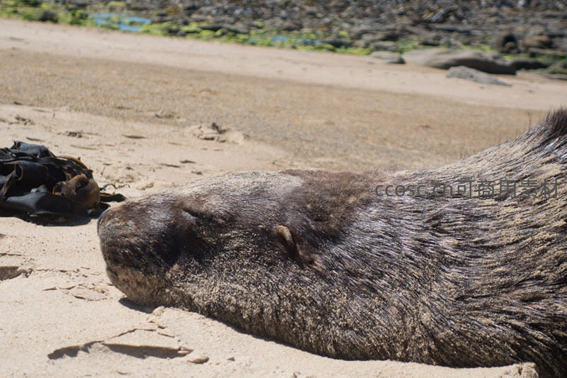 海狮静卧沙滩休憩,毛发沾沙,背景礁石与海藻点缀