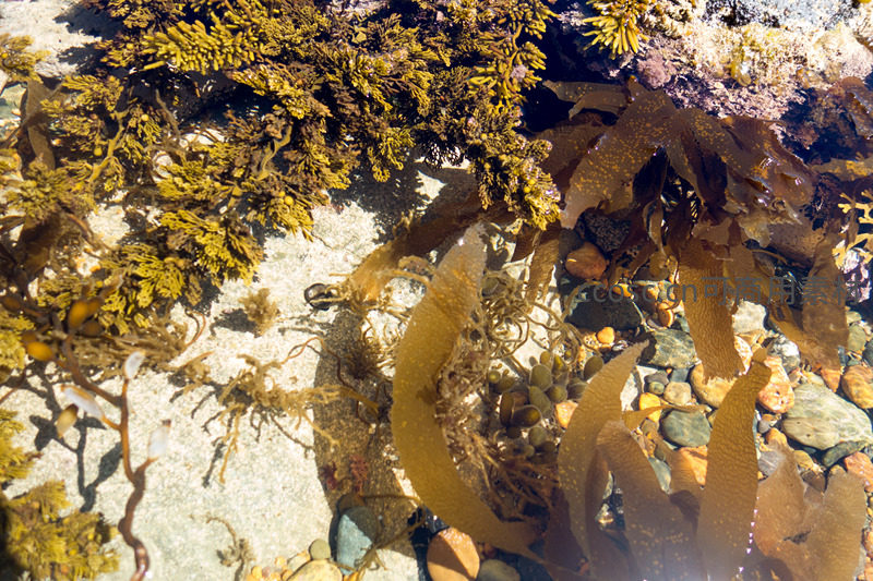 清澈浅水中黄绿海藻丛生,石子与褐藻交织成斑斓海底图景