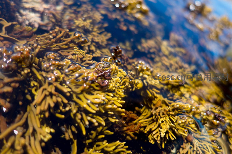 潮间带黄褐色海藻特写,水珠晶莹,纹理清晰可见